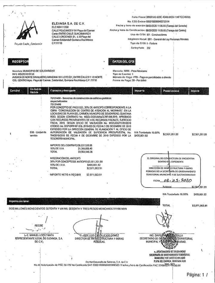 Casi un año después, el 30 de diciembre de 2019, se firmaba el contrato de obra pública MSOL-DGIDUMAyCC-RF-059-2019 (construcción de Centro de Atención al Migrante) por 9 millones 903 mil 546 pesos entre el ayuntamiento y la empresa foránea ELEHNSA S.A. de C.V., constituida en Veracruz, sin arraigo en el estado, y cuyo domicilio fiscal declarado en el contrato (calle Pelícanos entre calle Guacamayas y calle Loros, manzana 91 lote 10, número exterior V-064, fracc. Las Palmas, Playa del Carmen) no es localizable, y de acuerdo al Registro del Padrón de Contratistas del Estado de Quintana Roo la empresa señaló un domicilio fiscal totalmente diferente al del contrato firmado con el gobierno municipal de Solidaridad, el cual es: calle Araucarias #22, col. Higueras, Teocelo, Veracruz.