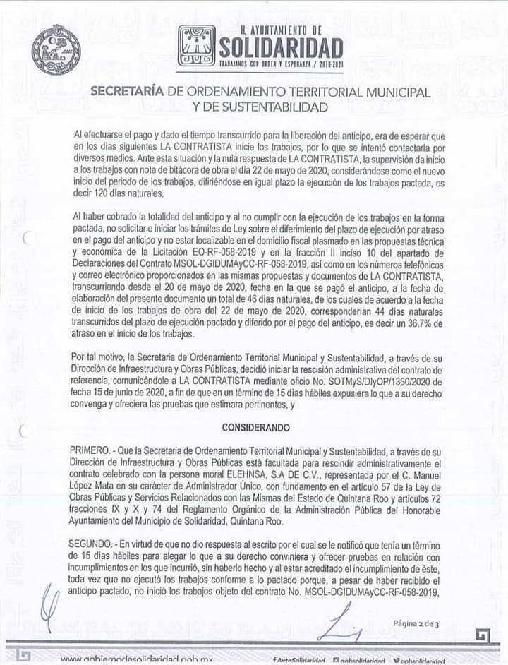 Finalmente, el 6 de julio de 2020 el ayuntamiento emitió el Oficio de Resolución al Procedimiento de Rescisión Administrativa de Contrato número SOTMyS/DIyOP/1570/2020, dirigiéndolo al mismo domicilio fiscal que antes había señalado como no localizable, sin embargo, y de manera extraña, mientras se procedía a la rescisión del contrato, el ayuntamiento RESERVÓ toda información sobre el caso por 5 años, incluyendo toda la de la información sobre la fianza, convenios modificatorios y demás. Cabe señalar que ya antes, la empresa ELEHNSA había dejado varias obras inconclusas en el estado de Veracruz, y en esta ocasión solo cobró el anticipo en Solidaridad y se escapó.