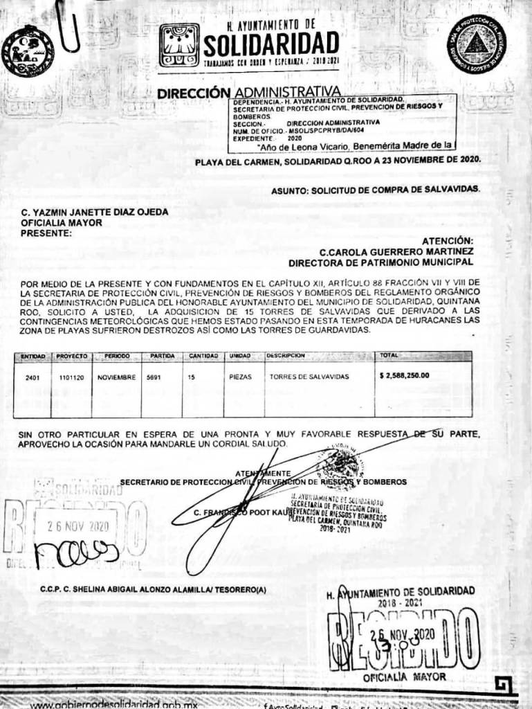 Debido a que el presupuesto del municipio de Solidaridad en el año 2020 fue del orden de los 2,565 millones de pesos, Francisco Pool Kauil “le metió uña” a la partida correspondiente a la Secretaría de Protección Civil, Prevención de Riesgos y Bomberos mediante varias compras que están pendientes de ser auditadas, entre ellas una por un monto de DOS MILLONES, QUINIENTOS OCHENTA Y OCHO MIL, DOSCIENTOS CINCUENTA PESOS ($ 2,588,250.00) por la compra de 15 torres de vigilancia para guardavidas, solicitada a Yazmin Janette Díaz Ojeda, Oficial Mayor, el pasado 26 de noviembre por medio del oficio MSOL/SPCPRYB/DA/604, solicitud firmada por el propio Francisco Poot Kauil.