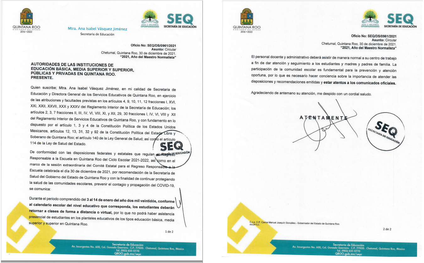 Por medio del oficio SEQ/DS/0691/2021, la secretaria de educación de Quintana Roo, Ana Isabel Vázquez Jiménez, informó a las autoridades educativas del estado que el regreso de clases presenciales será pospuesto por lo que del 3 de enero y hasta el 14 del mismo mes de 2022, las clases deberán ser virtuales.
