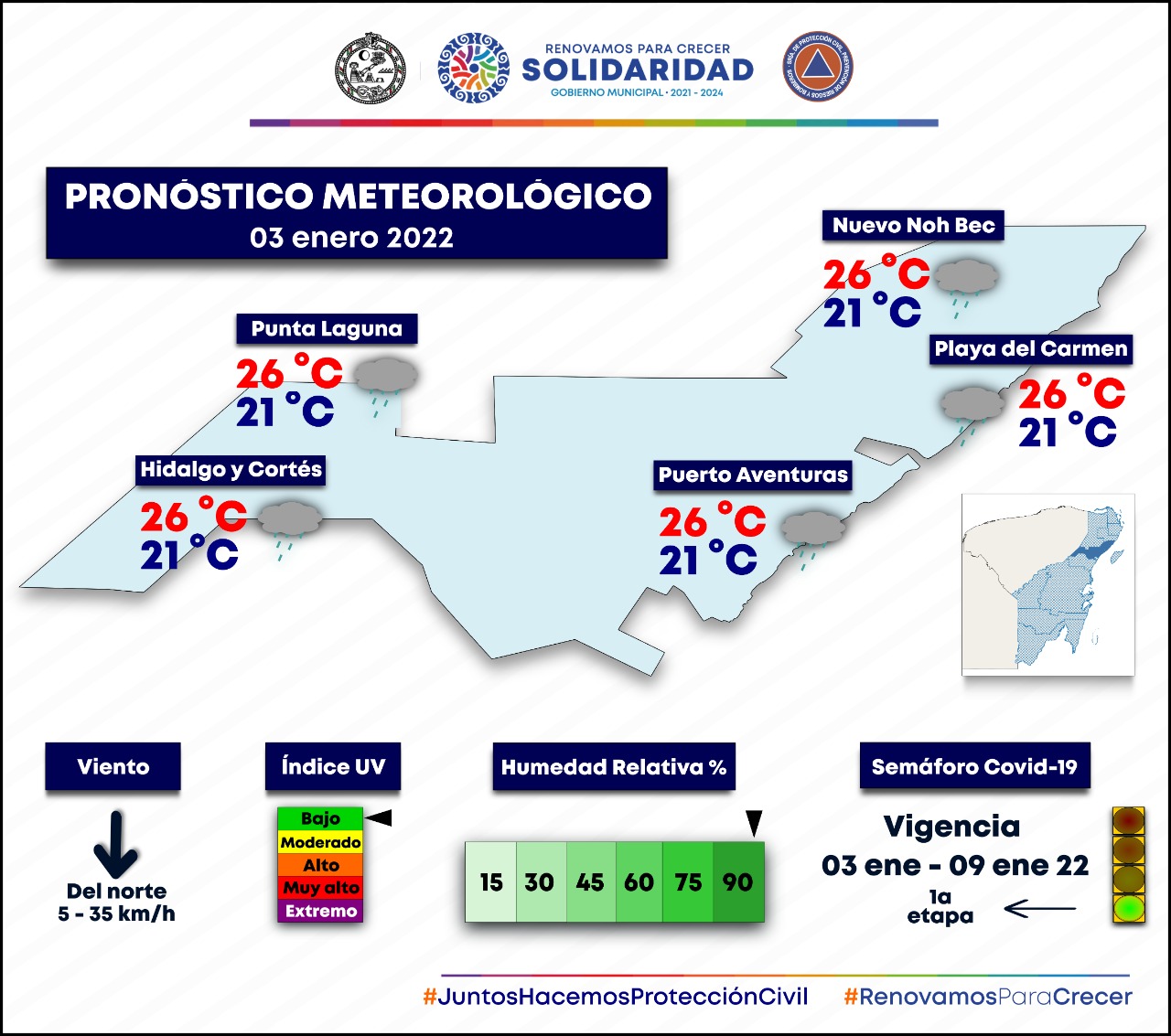 🌧️ Se espera un día fresco y nublado, con lluvias ocasionales de ligera a moderada intensidad en todo el municipio debido a la llegada del frente frío no. 19.
