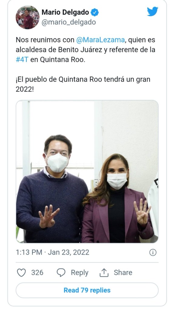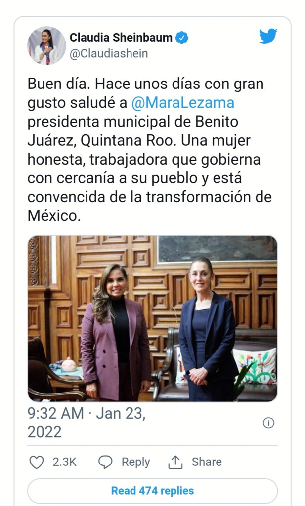 La jefa de gobierno de la Ciudad de México publicó, «Buen día. Hace unos días con gran gusto saludé a @MaraLezama presidenta municipal de Benito Juárez, Quintana Roo. Una mujer honesta, trabajadora que gobierna con cercanía a su pueblo y está convencida de la transformación de México», en referencia a la alcaldesa de Cancún.