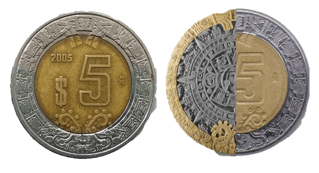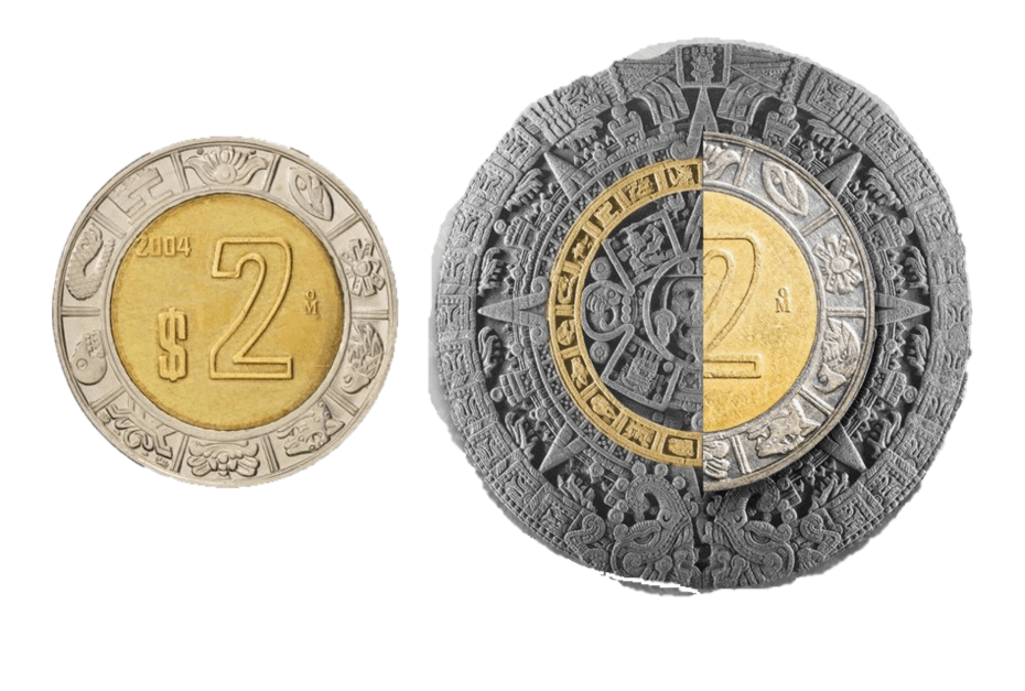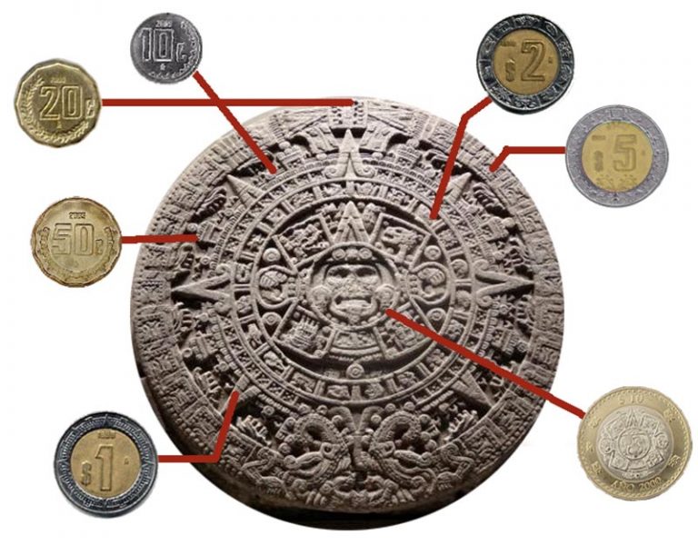 ¿Has puesto atención a las monedas con las que pagas diariamente? Las monedas mexicanas, próximas a desaparecer, tienen grabados que recuerdan a la gran cultura mexica y su arte, ya que llevan en su centro y en sus contornos los círculos de la piedra del sol, también llamada calendario azteca.
