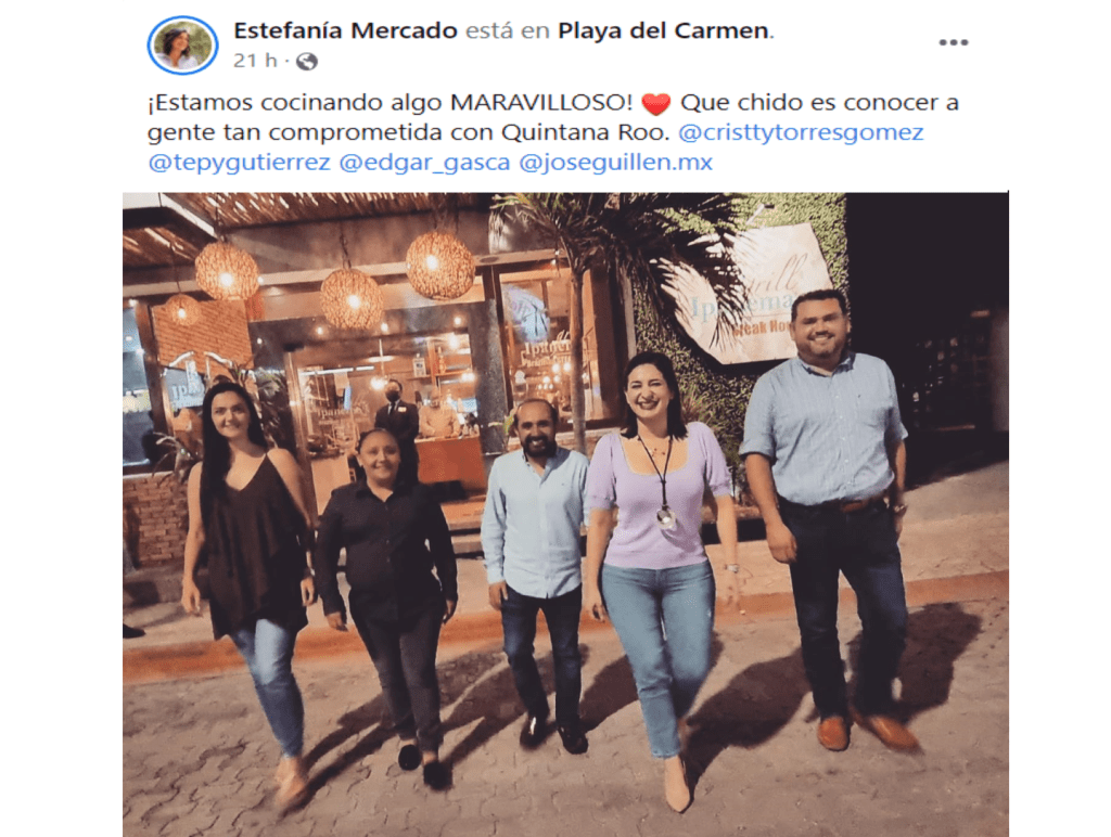 Pero la crisis de morena va más allá, puesto que en redes sociales, Estefanía Mercado, publicó una fotografía en la que aparece acompañada por tres diputados de morena en la XVI Legislatura, Cristina Torres, Euterpe Gutiérrez y Edgar Gasca, así como por José Luis Guillén, diputado del MAS, dando a conocer que están cocinando algo MARAVILLOSO, “Que chido es conocer a gente tan comprometida con Quintana Roo” expresó la ex aspirante panista; situación que se puede interpretar como una estrategia para fortalecer el proyecto de morena en Quintana Roo, al considerar que Cristina Torres ha logrado una buena relación con Mara, al grado de que es considerada como la principal operadora electoral para la campaña de morena en Distrito Electoral 1 Federal.