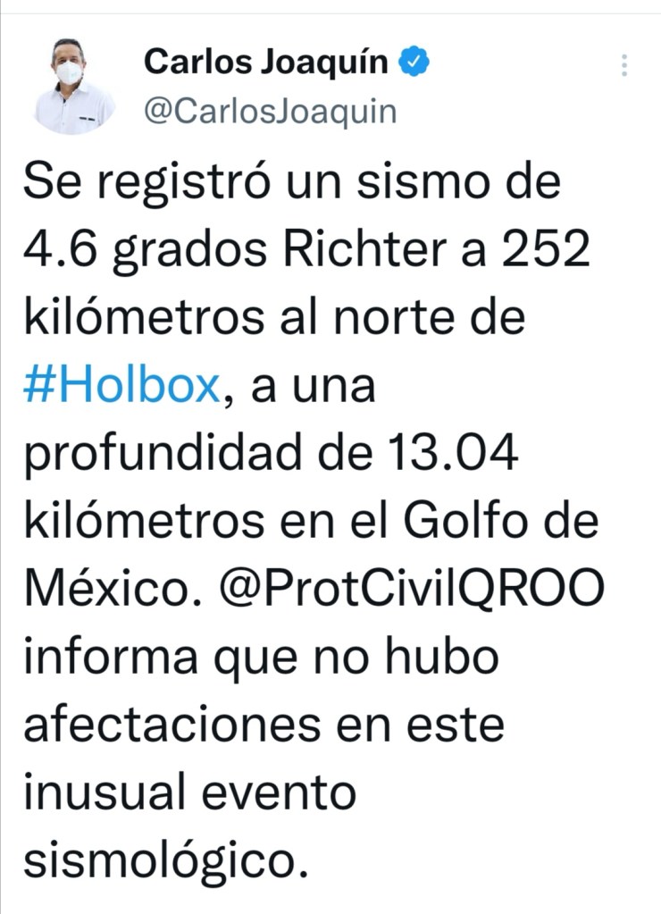 Por su parte, el Servicio Sismológico Nacional informó que el fenómeno se produjo en Holbox por ser el punto más cercano del epicentro, en el territorio nacional.