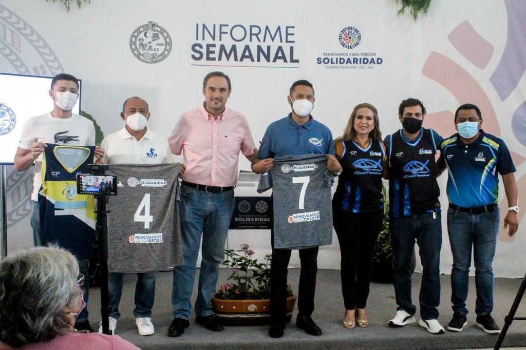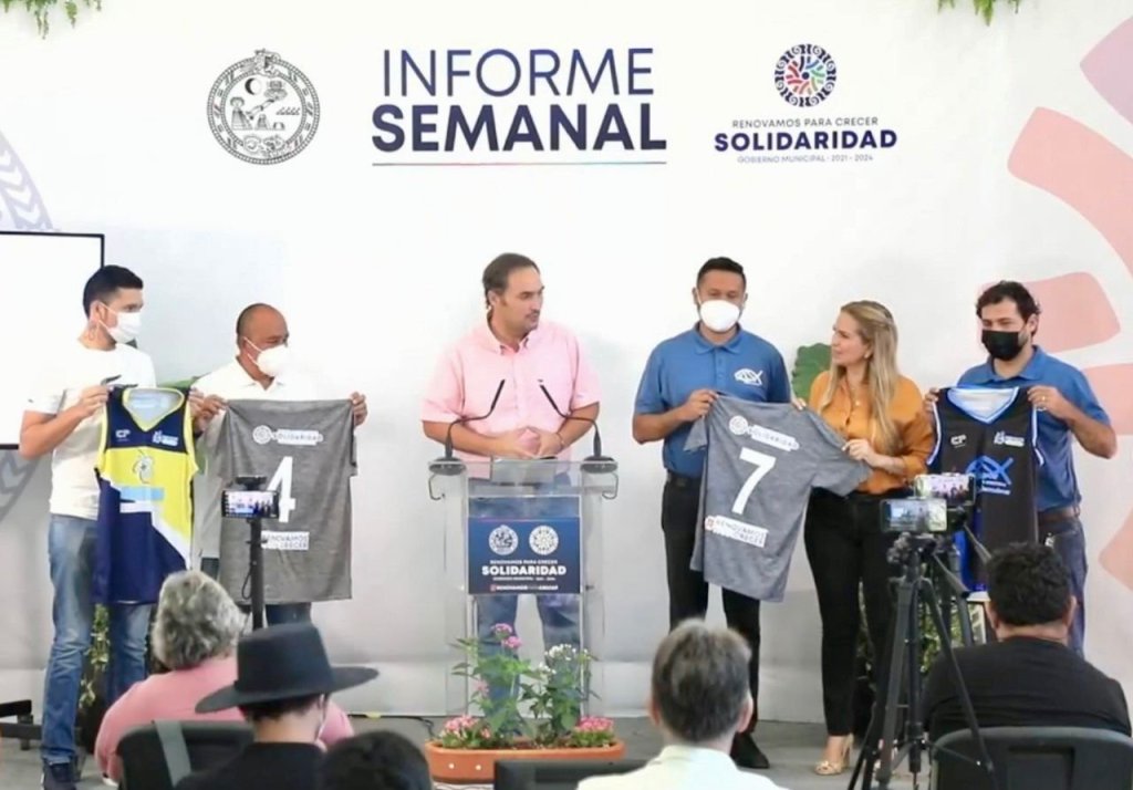 Playa del Carmen, Solidaridad a 29 de junio de 2022.- Durante el informe semanal de la presidenta municipal Lili Campos Miranda, junto al director del Instituto del Deporte (IDM) de solidaridad Amador Gutierrez Guigui, se hizo entrega, a los equipos que participan en la liga semi profesional de baloncesto del estado, sus uniformes y apoyos correspondientes públicamente como representantes del deporte ráfaga de la localidad.