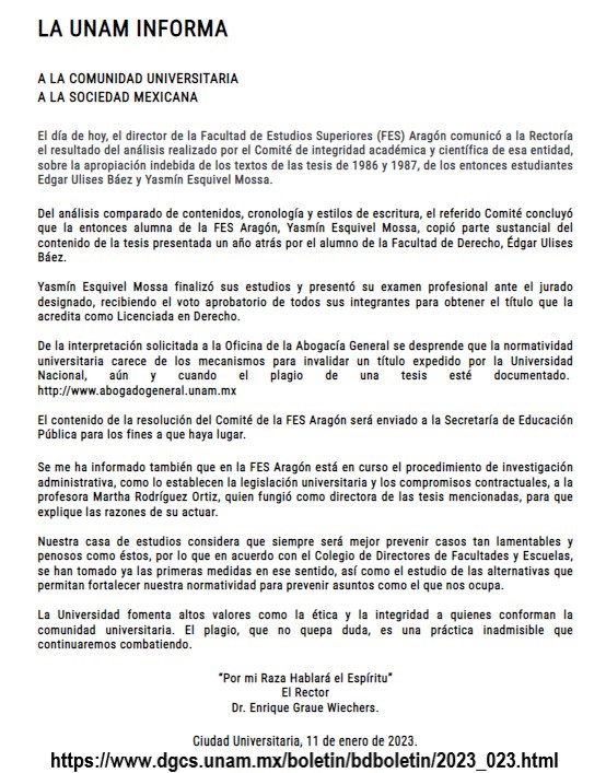 La UNAM publicó su Boletín UNAM-DGCS-023 el pasado 11 de enero de 2023 por el cual da a conocer el resolutivo de la FES Aragón sobre el asunto e informa que turnará a la Secretaría de Educación Pública el asunto para los fines que haya lugar.