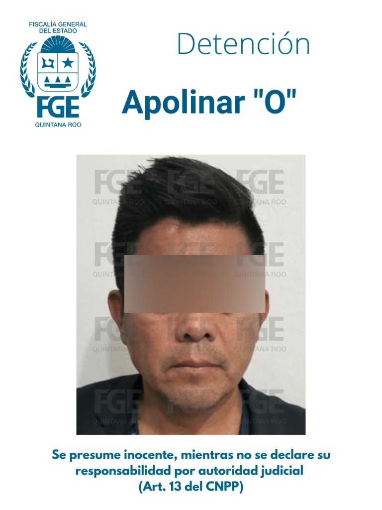 Cancún, Quintana Roo, a 22 de enero de 2023. La Fiscalía General del Estado, que encabeza Óscar Montes de Oca, informa que se cumplimentó una orden a aprehensión en contra de Apolinar “O”, por su presunta participación en el delito de homicidio doloso en contra de tres personas en esta ciudad.