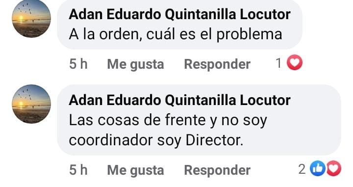 Es tanta la prepotencia de este personaje que en días pasados un medio de comunicación electrónico publicó una nota en la que se da a conocer que Adán Eduardo Quintanilla Ávila no posee título profesional alguno, por lo que el engreído y prepotente funcionario público, en su acostumbra actitud de perdona vidas respondió a la nota enviando una imagen con el documento que lo acredita como Director de Comunicación Social como si tal nombramiento lo autorizara a ejercer la profesión en forma legal.