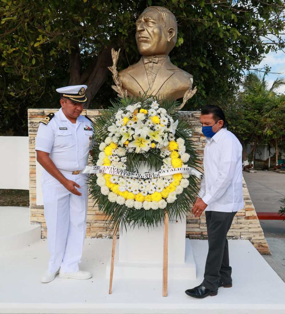 Posterior a la ceremonia cívica, alumnos, docentes, personal administrativo, autoridades municipales e invitados especiales colocaron una ofrenda floral en el busto de Benito Juárez, acompañaron al Secretario General del Ayuntamiento durante la ceremonia los directivos del plantel escolar Mildred Gloribel Aguilar Cruz, Esmeralda Gil Ordoñez, la directora de Educación de Isla Mujeres, Luz María Rodríguez Méndez e integrantes del Cabildo.