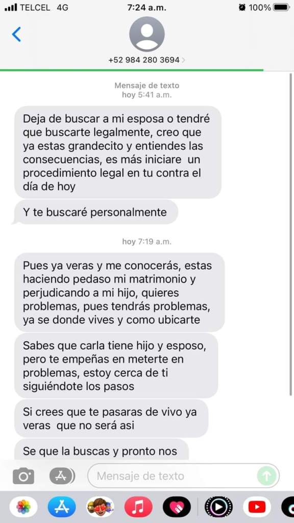 En una captura de pantalla se leen amenazas, donde el presunto esposo de 59 años, le dice al joven que se aleje de la mujer, o de lo contrario pagará las consecuencias ante la ley.