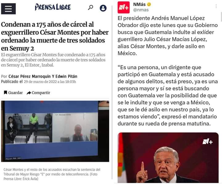 López Obrador ha informado de la solicitud del indulto durante su conferencia de prensa matutina en Ciudad de México, aunque no ha dado más detalles sobre el proceso o la respuesta del Gobierno del presidente guatemalteco, Alejandro Giammattei, quien en 2020 se pronunció a favor de la condena contra Montes. “Celebro que César Montes haya sido condenado a 175 años de cárcel tras ser vencido en juicio por el asesinato de tres soldados en pleno cumplimiento del deber. Hoy se hace justicia en su memoria”, dijo el mandatario de Guatemala.
