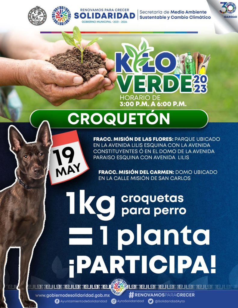 Playa del Carmen, Solidaridad, 17 de mayo del 2023.- Cuidar el medio ambiente es prioridad del gobierno que encabeza Lili Campos, por lo que a través de la Secretaría de Medio Ambiente Sustentable y Cambio Climático se realizarán los programas “Kilo Verde” y “Croquetón”, el viernes 19 de mayo.