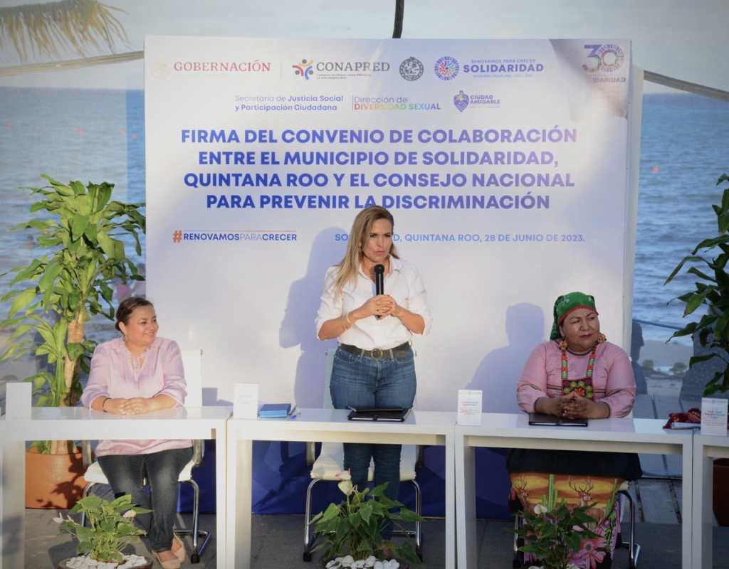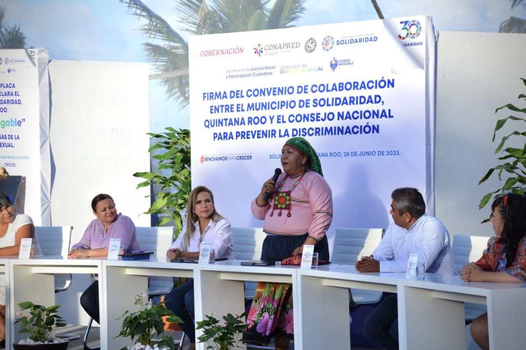 Playa del Carmen, Solidaridad a 28 de junio del 2023.- Con el objetivo de realizar trabajos en conjunto para el combate a la discriminación, el gobierno municipal que lidera la presidenta Lili Campos firmó un convenio con el Consejo Nacional para Prevenir la Discriminación (Conapred), al tiempo de la develación de la placa con la que se declara a Solidaridad «Ciudad amigable» con las personas de la diversidad sexual.