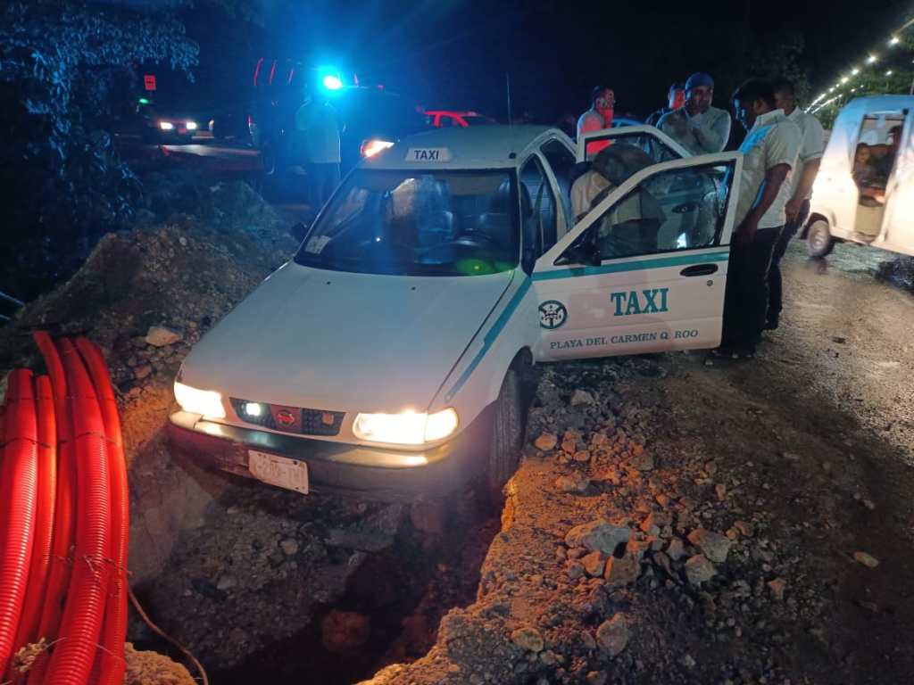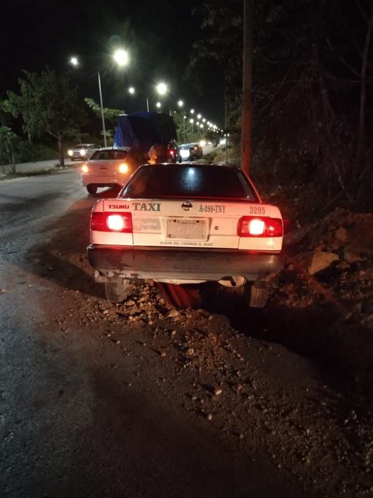Al arribar elementos de la dirección de tránsito municipal observaron un taxi Nissan Tsuru con número 3295 y placas A-289-TNY. Clavado en una zanja ubicada sobre la avenida Chit y Colosio, afortunadamente no hubo personas lesionadas.