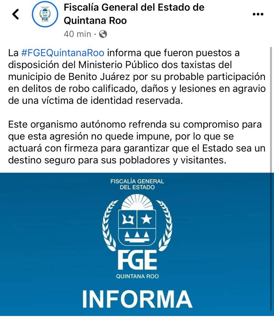 El Uber se fue con dirección a la avenida Yaxchilán y ahí fue donde lo alcanzaron y le cerraron el paso; le abrieron la cajuela de la camioneta y le empezaron a pegar con piedras al parabrisas y él por la desesperación aceleró y cayeron las maletas de las turistas.