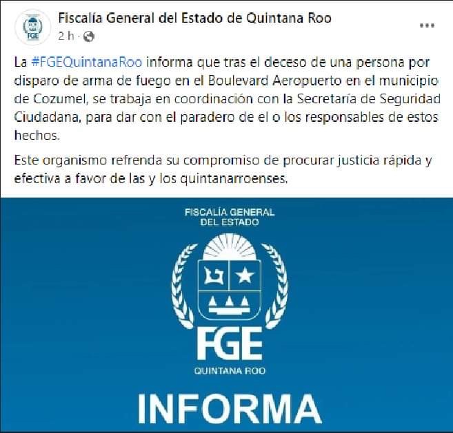 Por medio de unas escuetas líneas, la Fiscalía General del Estado (FGE), informó lo siguiente en su página oficial: “La #FGEQuintanaRoo informa que tras el deceso de una persona por disparo de arma de fuego en el Boulevard Aeropuerto en el municipio de #Cozumel, se trabaja en coordinación con la Secretaría de Seguridad Ciudadana, para dar con el paradero de el o los responsables de estos hechos”.
