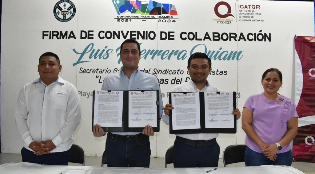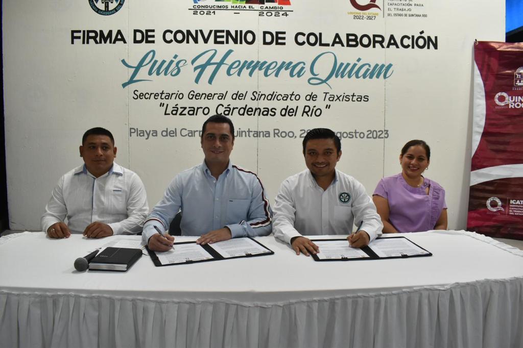 El secretario general del Sindicato de Taxistas “Lázaro Cárdenas del Río”, Luis Herrera Quiam, firmó un convenio de colaboración con el Instituto de Capacitación para el Trabajo de Quintana Roo (ICATQR), que busca beneficiar a socias y socios de la institución con cursos, talleres y evaluaciones de competencia laboral, para brindarles más oportunidades y mejorar su rendimiento.