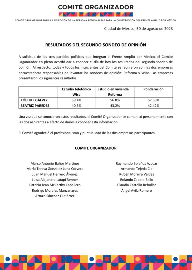 La información de la encuesta se reveló cuatro días antes del domingo 3 de septiembre, fecha pactada inicialmente. Tiempo más tarde en conferencia de prensa el PRI en conferencia de prensa se dió y bajo de la contienda a Beatriz Paredes y declinaron en a favor de Xóchitl Gálvez.