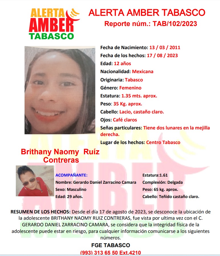 El detenido está relacionado con una alerta Amber emitida por la Fiscalía General del Estado de Tabasco, para localizar a la menor Brithany Naomy Ruiz Contreras de 12 años de edad, desaparecida el pasado 17 de agosto luego de ser vista por última vez con el ahora detenido.