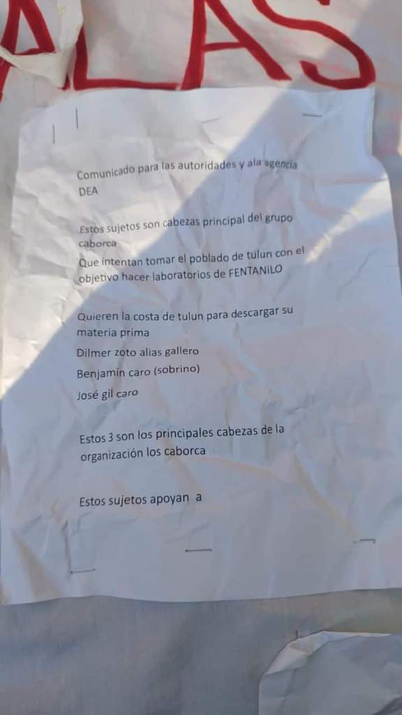 Además, aseguran en sus escritos que el también conocido cártel de la familia Caro Quintero, está estableciendo o pretende establecer laboratorios de fentanilo en uno de los municipios más importantes de Quintana Roo. En hojas en blanco acusan de permitir reuniones que realizan en esa cabecera municipal Dilver Soto «El Gallero», Benjamín Caro «El Uno» y el propio José Gil Caro Quintero «El Pelo Chino», para planear su expansión y dominio sobre Tulum y sus alrededores.