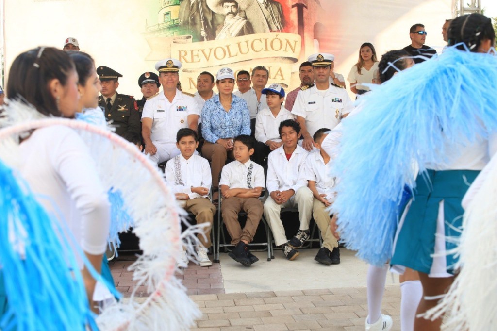 Playa del Carmen, Solidaridad, 20 de noviembre de 2023.- Con la participación de más de 8 mil 500 personas se realizó el desfile cívico-deportivo por el CXIII Aniversario de la Revolución Mexicana, mismo que fue presidido frente al palacio municipal del centro, por la presidenta Lili Campos, acompañada por representantes del Ejercito Mexicano, Secretaría de Marina, funcionaros municipales y el cabildo infantil.
