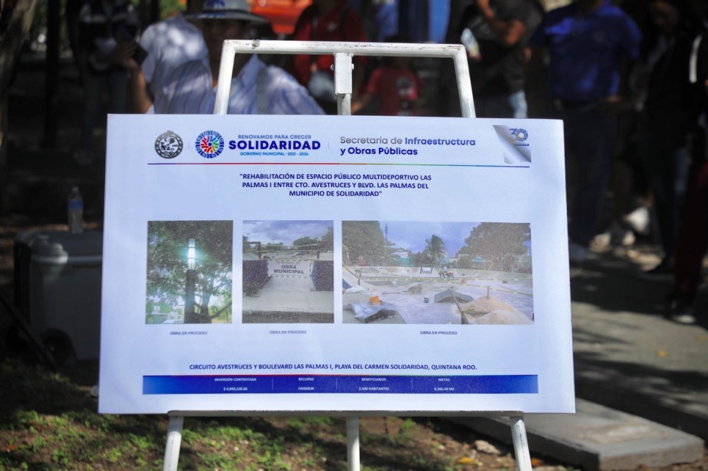 Playa del Carmen, Solidaridad, 21 de noviembre de 2023.- En beneficio de más de 2 mil 500 habitantes, la presidenta municipal de Solidaridad Lili Campos constató el arranque de la rehabilitación integral del espacio público multideportivo en el fraccionamiento Palmas I, con lo cual se atiende las necesidades de recreación y sano esparcimiento de niños, jóvenes y adultos mayores, quienes disfrutarán plenamente de todas las áreas disponibles.