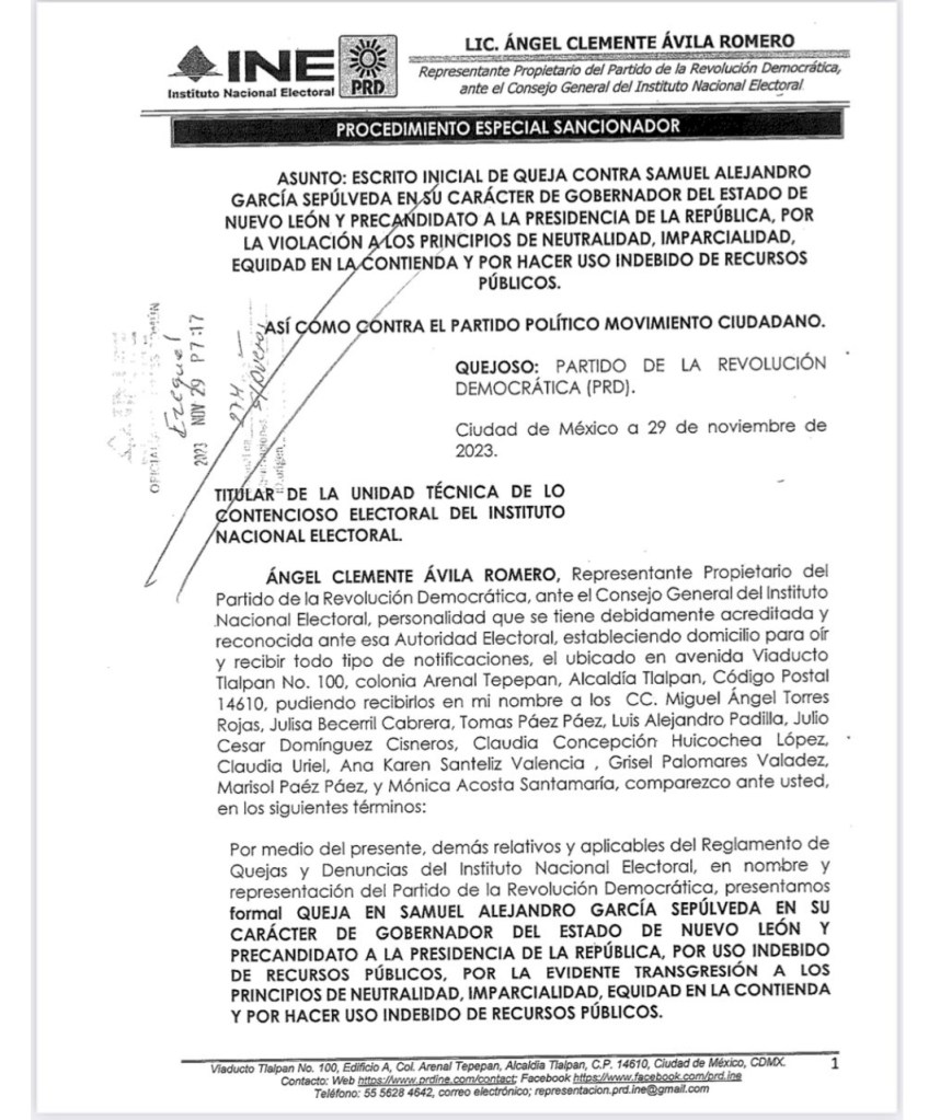El Partido de la Revolución Democrática (PRD) ha presentado una queja ante el Instituto Nacional Electoral (INE) solicitando la cancelación del registro de Samuel García como precandidato único a la presidencia por el partido Movimiento Ciudadano.