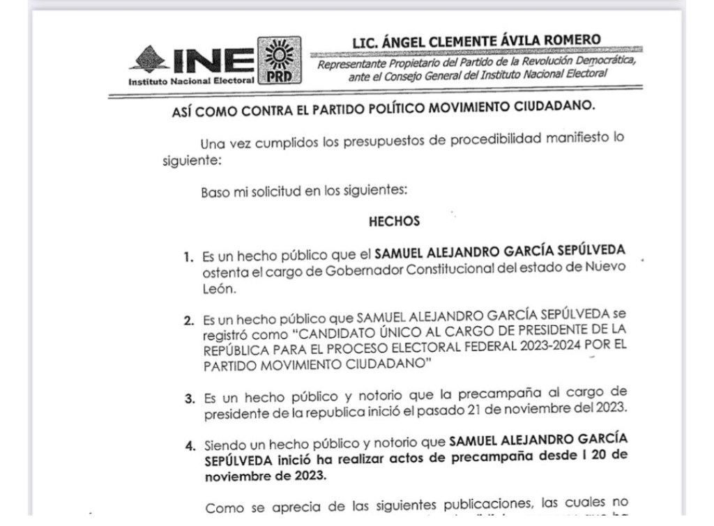 Ángel Ávila, representante del PRD ante el INE, anunció la solicitud en sus redes sociales, afirmando: “Hemos solicitado de manera formal la cancelación del registro del precandidato por Movimiento Ciudadano a la Presidencia de la República, Samuel García, por violaciones a la Constitución, pues NO puede desempeñar el cargo de Gobernador del estado de Nuevo León, y al mismo tiempo ser precandidato a la Presidencia de la República”.