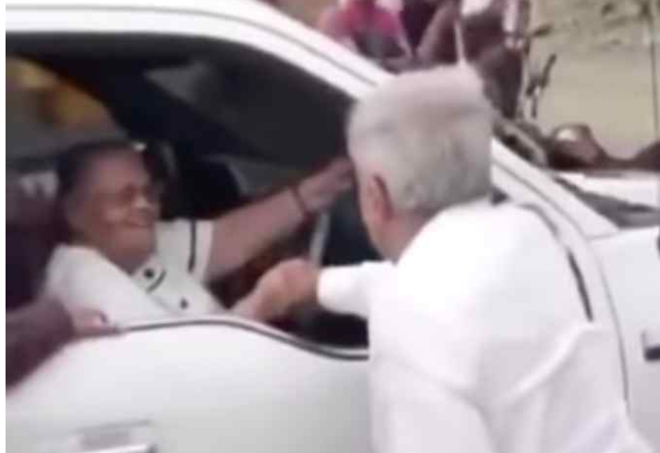 -Nada más salude… Nada más salude no te bajes. Dijo un hombre de baja estatura de unos 70 años de edad, sombrero blanco, lentes oscuros, camisa morada y mucha familiaridad con el presidente, pues al acercarse la figura presidencial a la camioneta, el mencionado personaje le tomó del codo izquierdo como para limitar su aproximación. Una mano de mujer que no se ve en la toma, pero que se advierte pudiera ser de alguna de sus asistentes.