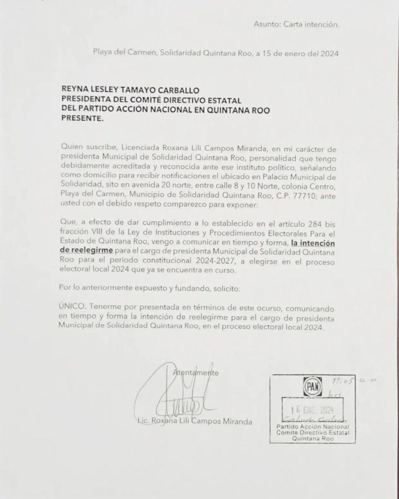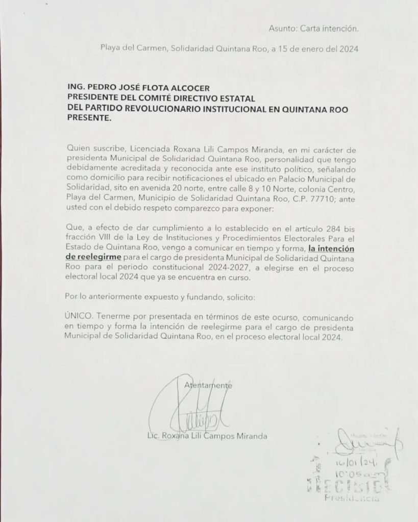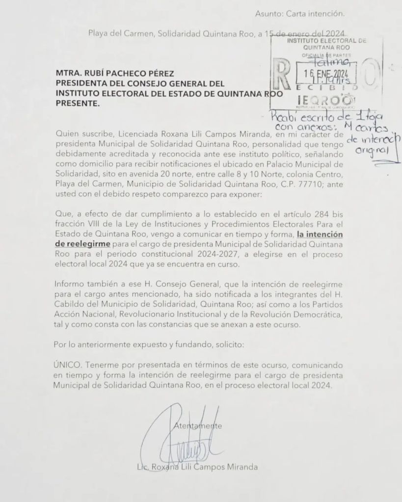 Mismo caso, lo notificó a Rubí Pacheco Pérez, presidenta del Consejo General del Instituto Electoral del Estado de Quintana Roo, su deseo de la reelección, a efecto de cumplir con el artículo 284 bis fracción VIII de la Ley de Instituciones y Procedimientos Electorales.