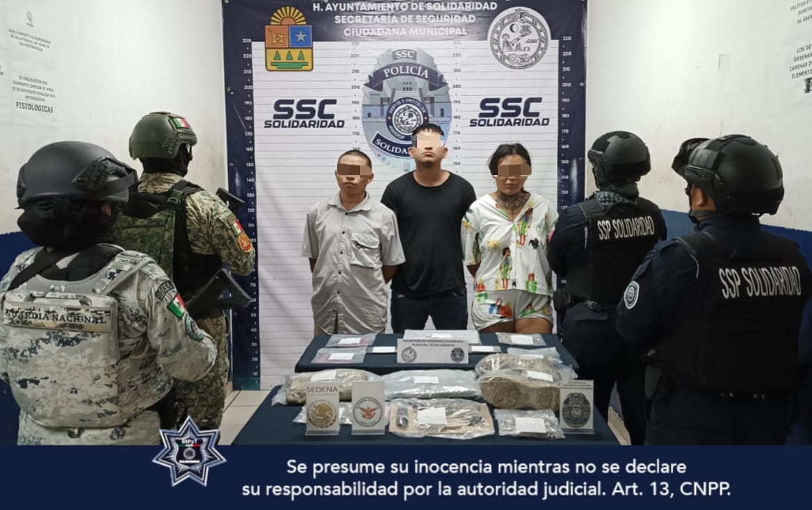 En una rápida acción de respuesta inmediata, la Policía Municipal de Solidaridad realizó la detención de 3 sujetos y el aseguramiento de 1 arma de fuego, cartuchos útiles y 30 posibles dosis de narcóticos durante el operativo de vigilancia permanente en el fraccionamiento Las Palmas.