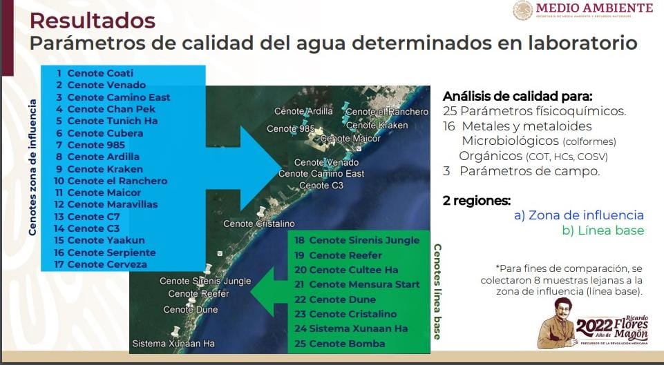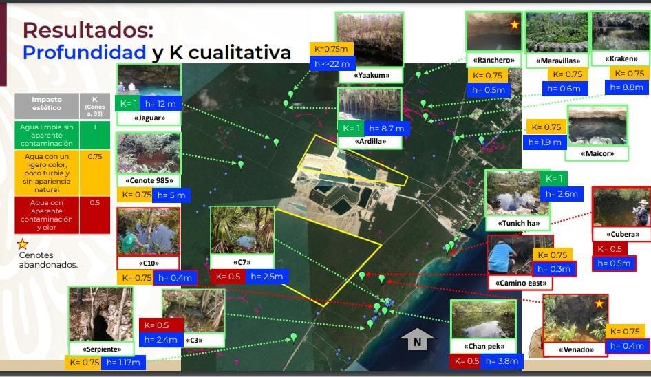 Como señalamos al principio, como parte del dictamen que realizó la Semarnat, destacó los daños a la biodiversidad, que por ahora no tocaremos, pero en cuanto al análisis hídrico, se estudiaron 25 cuerpos de agua que hay dentro y en los alrededores de CALICA para determinar los parámetros de calidad del agua, profundidad y los impactos, es decir en el sistema de cenotes la calidad del agua y el flujo regional por la actividad minera.