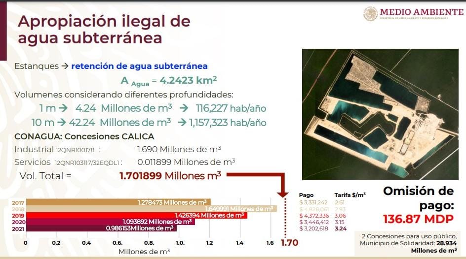 En junio del 2022, la Secretaría de Medio Ambiente y Recursos Naturales (Semarnat) presentó los resultados de un dictamen elaborado tras un arduo trabajo de campo y de gabinete, a efecto de evaluar los impactos ambientales que se derivaban de la extracción industrial de roca caliza por parte de Calizas Industriales del Carmen (CALICA), hoy llamado Sac Tun, en los municipios de Solidaridad y Cozumel. En dicho dictamen participaron la Comisión Nacional de Áreas Naturales Protegidas (Conanp); el Instituto Nacional de Ecología y Cambio Climático, el Instituto Mexicano de Tecnología del Agua y otras áreas y dependencias. Entre las diversas irregularidades detectadas destaca el tema del agua, la calidad del líquido, las alteraciones al flujo regional y síntomas en territorio; y sobre todo, la apropiación ilegal de agua subterránea que a la postre llevaron a la Comisión Nacional del Agua (Conagua) a retirar dos concesiones con las que contaba la empresa de capital estadounidense; una concesión (12QNR103117/32EQDL1) por los servicios y la otra concesión (12QNR100178) de carácter industrial.
