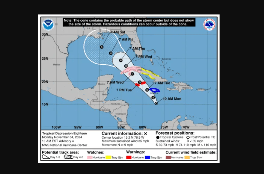 En el último boletín del Centro Nacional de Huracanes, se confirmó que el sistema en el Caribe ha evolucionado a la Depresión Tropical 18, con potencial de convertirse en tormenta tropical y huracán en los próximos días, y amenaza con dirigirse hacia el Golfo de México.
