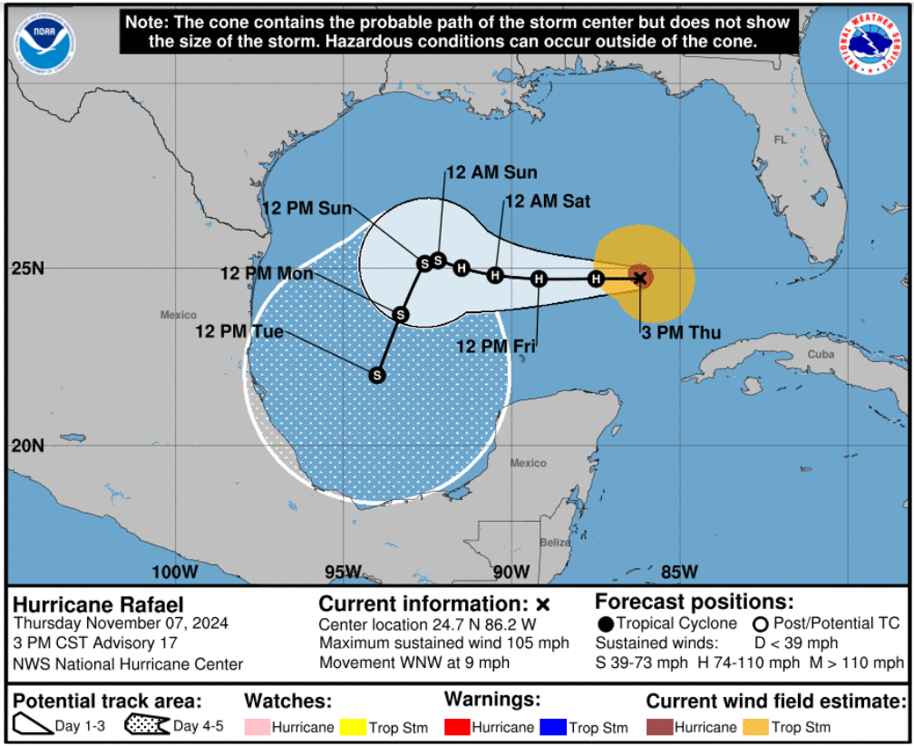 “Se pronostica que el huracán Rafael se moverá lentamente sobre el centro y el sur del Golfo de México durante este fin de semana y a inicios de la próxima semana. Los intereses en el sur y sureste del Golfo de México deben monitorear el progreso de este sistema”, señaló el Centro Nacional de Huracanes en su boletín.