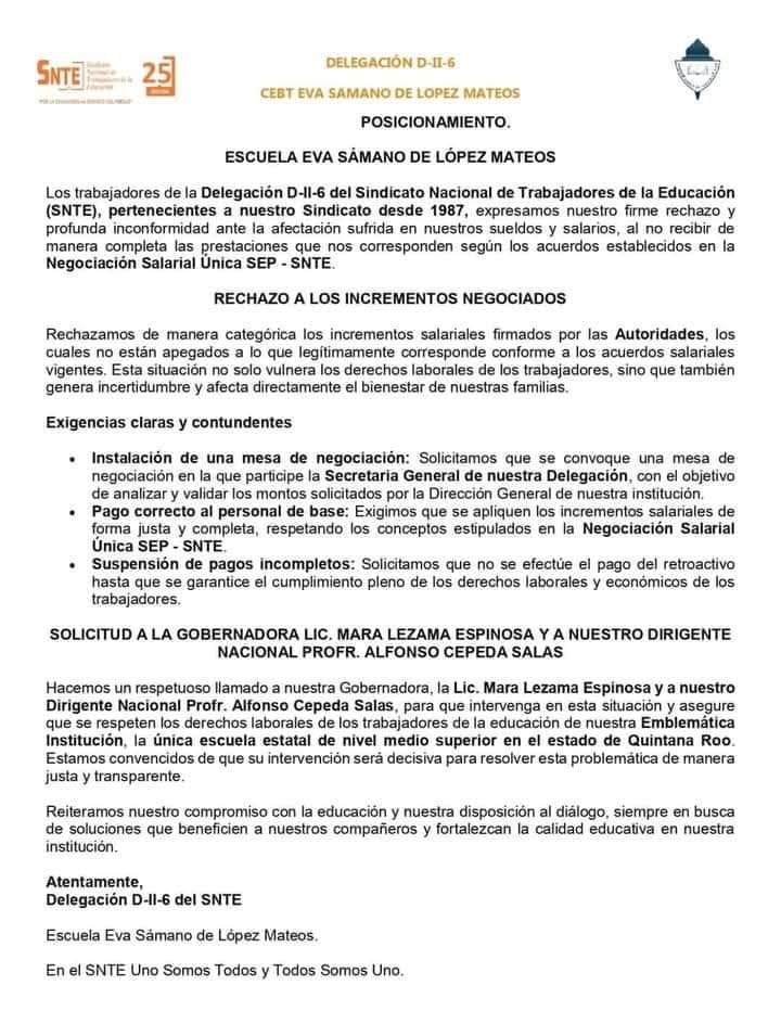 Los maestros exigen la intervención del Comité Nacional del SNTE y de la gobernadora Mara Lezama Espinosa, confiando en su compromiso con la justicia y la educación, pese a las declaraciones en contrario del secretario de conflictos estatal, Guillermo Ramos Trigueros.