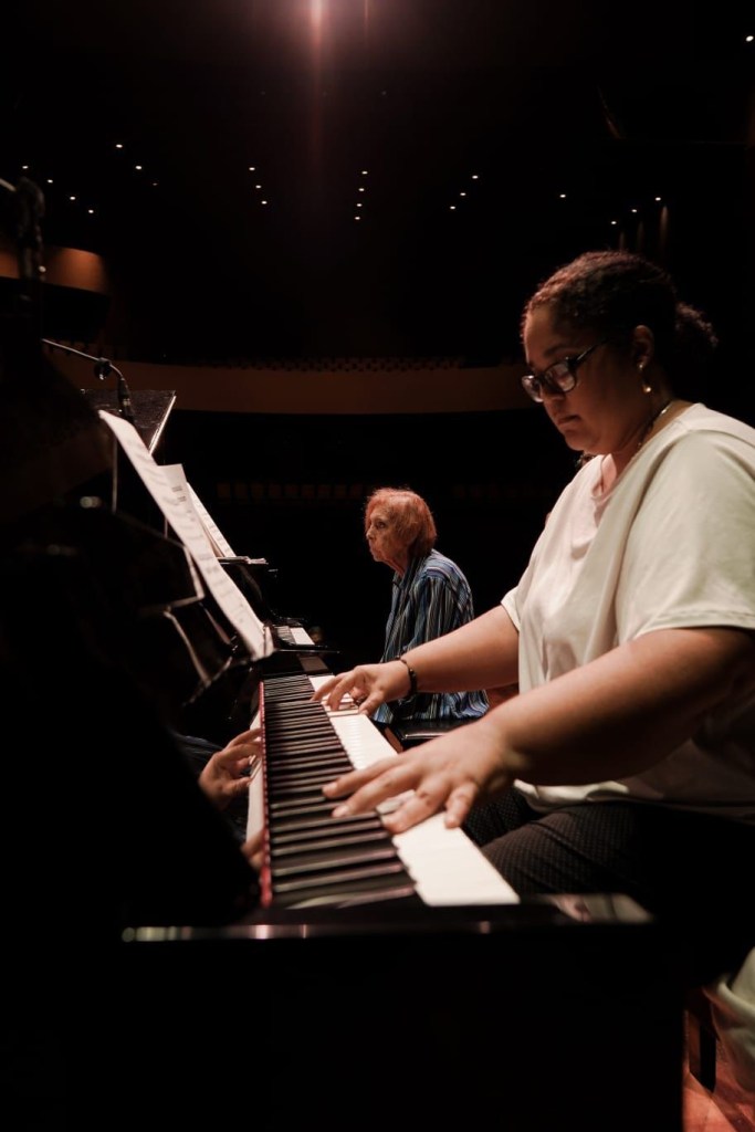 La noche inició con Teresita Delgado, quien, con 61 años de experiencia al piano, celebró su cumpleaños número 67 en esta ocasión tan especial. “El piano es el rey de los instrumentos; su interpretación requiere de una dinámica que equilibra suavidad e intensidad”, explicó mientras acomodaba sus partituras. Su interpretación de “Para Elisa” de Beethoven cautivó al público, destacando la complejidad de las notas en Sol y Fa, que alternaban entre las teclas negras y blancas.