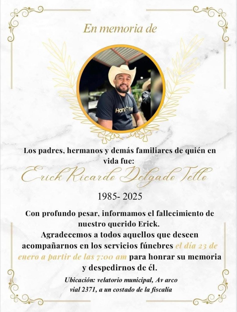 La diputada local Jeni Rubio expresó su pesar por el sensible fallecimiento de su primo Erick Delgado, quien fue ejecutado la madrugada de ayer en la Avenida Juárez con carretera federal.