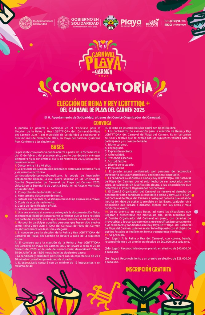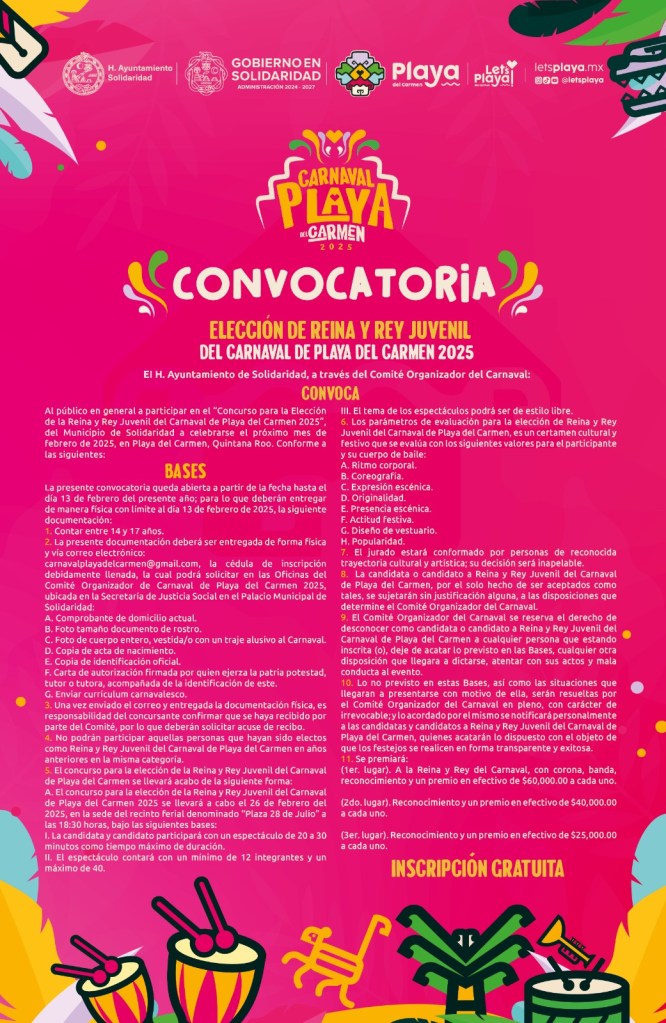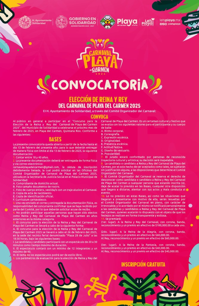 Las convocatorias para participar en los diferentes eventos ya están disponibles. Los interesados podrán encontrar toda la información en las redes sociales oficiales del ayuntamiento de Solidaridad y de la alcaldía de Puerto Aventuras, así como en diversos espacios públicos. Entre las actividades destacadas se encuentran la elección de reyes y reinas del Carnaval en las categorías libre, juvenil, infantil y LGBTTTIQA+, así como los concursos de comparsas en las categorías preescolar, infantil, juvenil y libre. Los ganadores de cada categoría recibirán reconocimientos y premios en efectivo.