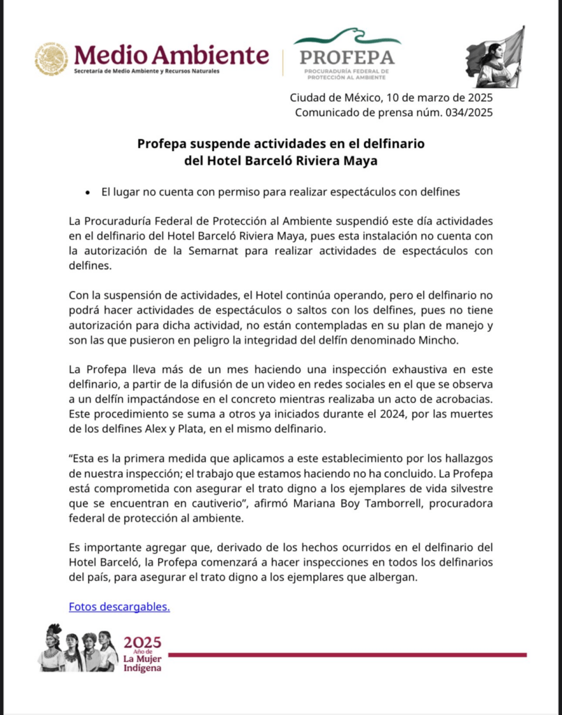 La Procuraduría Federal de Protección al Ambiente (PROFEPA) ha ordenado la suspensión de actividades en el delfinario del Hotel Barceló Riviera Maya tras detectar que la instalación opera sin la autorización de la Secretaría de Medio Ambiente y Recursos Naturales (Semarnat) para realizar espectáculos con delfines.