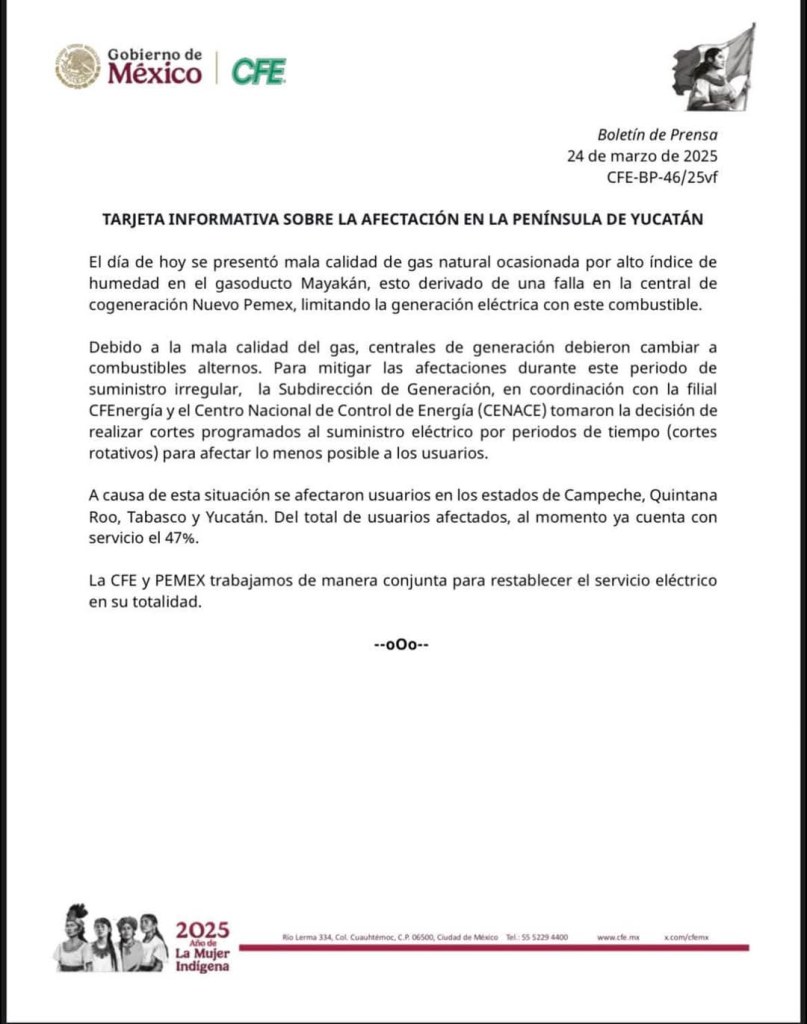 La vulnerabilidad del sistema energético mexicano quedó nuevamente al descubierto tras el reciente comunicado emitido el 24 de marzo de 2025 por la Comisión Federal de Electricidad (CFE) y Petróleos Mexicanos (PEMEX), en el que informaron sobre afectaciones en la península de Yucatán debido a la mala calidad de Gas Natural. El problema, provocado por un alto índice de humedad en el gasoducto Mayakán, limitó la generación eléctrica en la región, obligando a las centrales a utilizar combustibles alternos y aplicar cortes programados de suministro en Campeche, Quintana Roo, Tabasco y Yucatán. Aunque el 47% de los usuarios afectados ya recuperó el servicio, este incidente evidencia la fragilidad de la infraestructura energética del país.