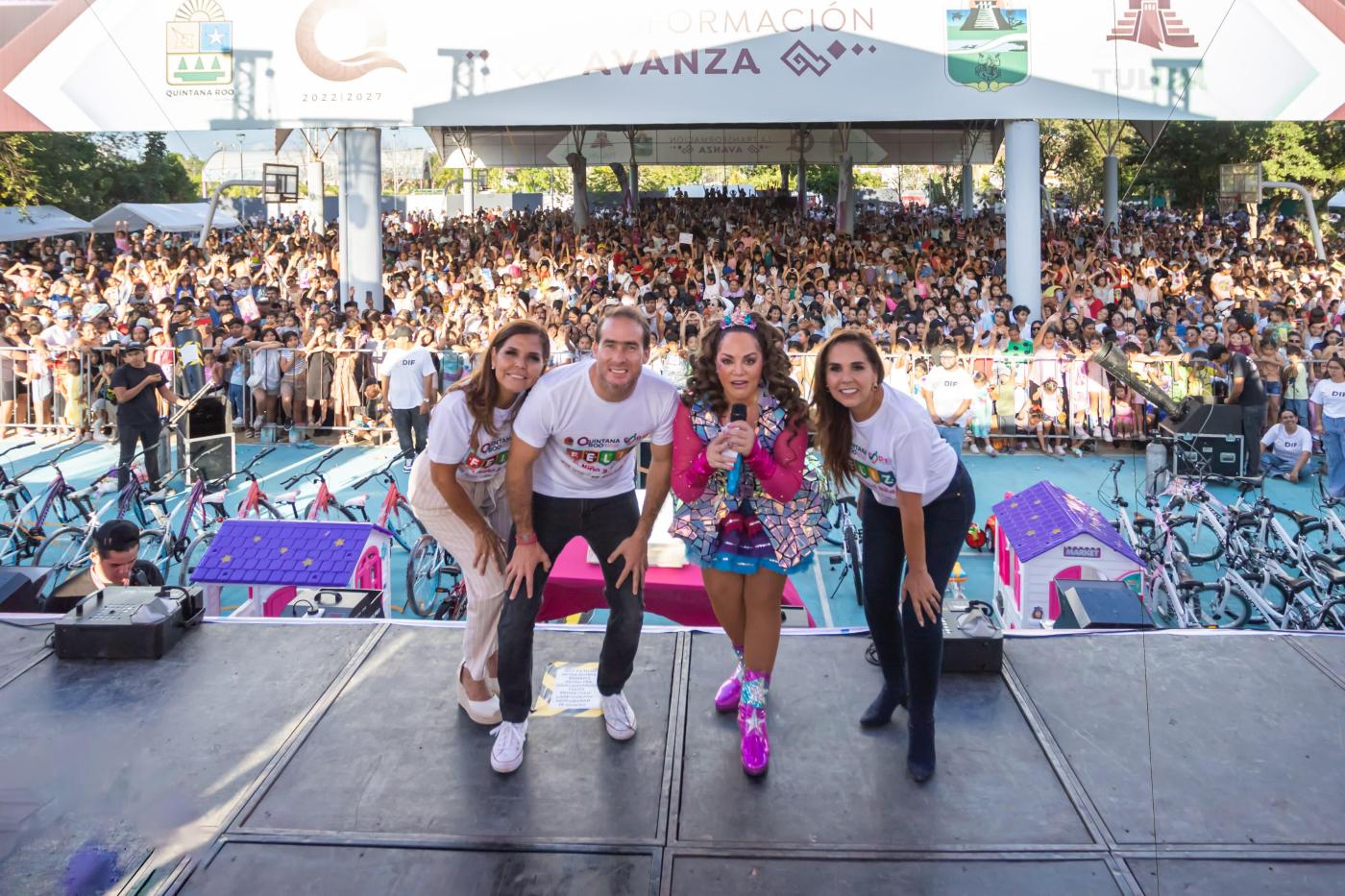 Más de 8 mil niñas y niños de Tulum vivieron una tarde inolvidable durante la celebración del Día de la Niña y el Niño, donde disfrutaron del espectacular show de la «reina de los niños», Tatiana. Con canciones clásicas como “No me quiero bañar”, “El patio de mi casa” y “Pimpón”, la artista hizo cantar y bailar a los pequeños, en un ambiente lleno de alegría, regalos y diversión, como parte de las acciones para fortalecer el tejido social.