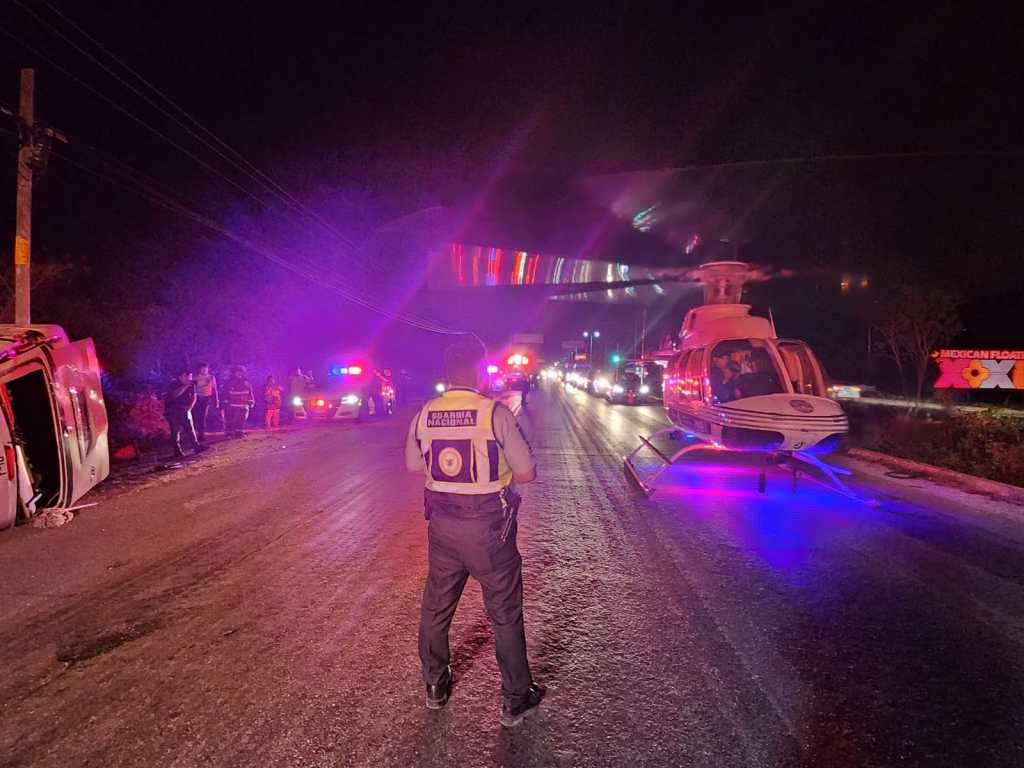 Un aparatoso accidente se registró la tarde de este martes en el kilómetro 332 de la carretera federal Cancún–Playa del Carmen, frente al hotel Royalton Moon Palace, donde una combi de transporte público se volcó tras poncharse una llanta. El saldo preliminar es de 14 personas lesionadas, una de ellas con lesiones graves.