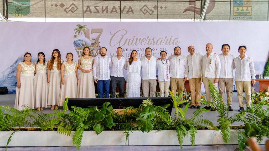 “Hoy celebramos que somos una comunidad vibrante, un pueblo que ha labrado su destino con sus propias manos, colmado de historia, sacrificio, pero sobre todo, de sueños”, expresó el presidente municipal Diego Castañón Trejo durante la ceremonia conmemorativa del 17° Aniversario de Tulum como noveno municipio de Quintana Roo.