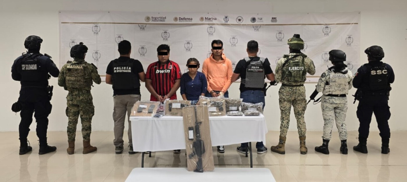 🔹 Segundo operativo: Marco Antonio “N”, Jorge Ezequiel “N” y Guadalupe “N” fueron detenidos en el fraccionamiento Pescadores Quinto Parque, con marihuana, un arma larga y dos cortas tipo escuadra.