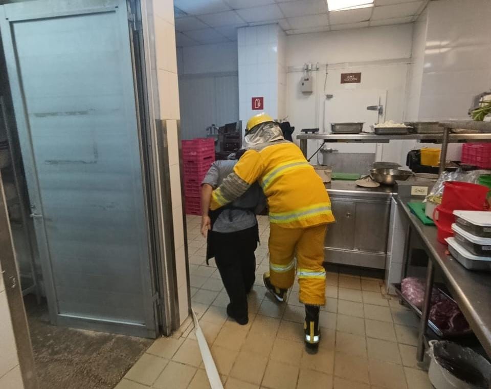 El ejercicio inició a las 10:55 horas, cuando se activó la alarma de incendio en la cocina central. De inmediato se evacuó a 580 colaboradores y se brindó atención a dos lesionados simulados: una persona con quemaduras y otra en paro respiratorio, lo que puso a prueba la capacidad de respuesta y la atención inmediata ante emergencias.
