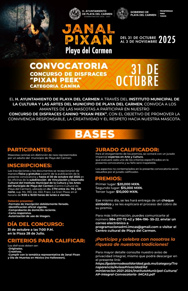 El Concurso de Disfraces “Pixan Peek” categoría canina se llevará a cabo el 31 de octubre en la Plaza 28 de Julio, donde la mascota ganadora recibirá 20 mil pesos.