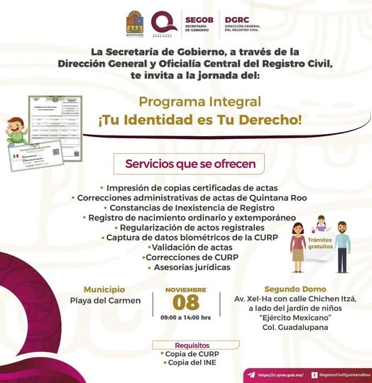 Con el propósito de garantizar el derecho a la identidad y acercar los servicios del Registro Civil a toda la población, el Gobierno de Playa del Carmen, encabezado por la presidenta municipal Estefanía Mercado, invita a la jornada del programa estatal “¡Tu Identidad es Tu Derecho!”, que se realizará este sábado 8 de noviembre en el segundo domo del fraccionamiento La Guadalupana.