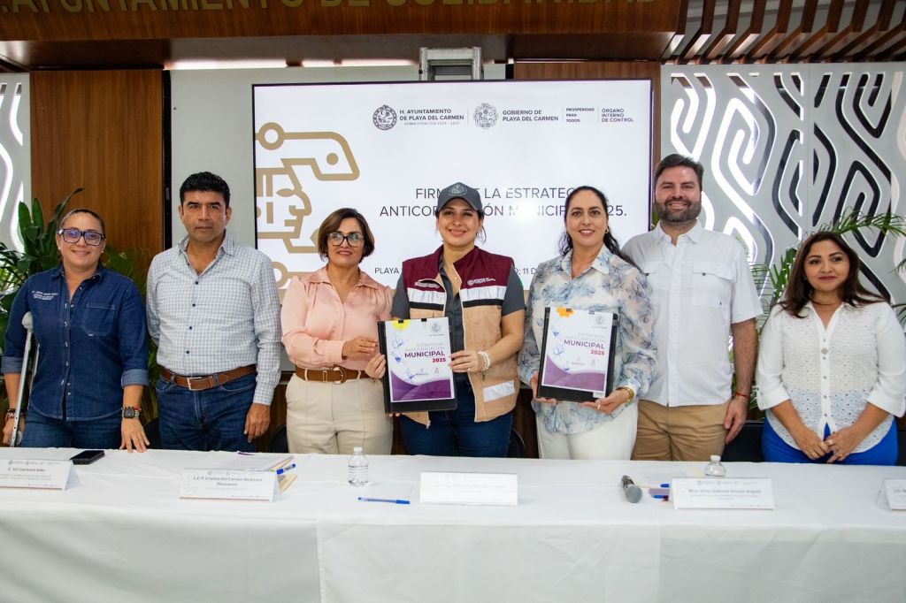 La presidenta municipal Estefanía Mercado, junto con la secretaria técnica de la Secretaría Ejecutiva del Sistema Anticorrupción del Estado de Quintana Roo (Sesaeqroo), Alma Gabriela Arroyo Angulo, firmaron este martes la Estrategia Anticorrupción Municipal 2025, un acuerdo que consolida el compromiso del Ayuntamiento de Playa del Carmen con la transparencia, la rendición de cuentas y la integridad en el servicio público.